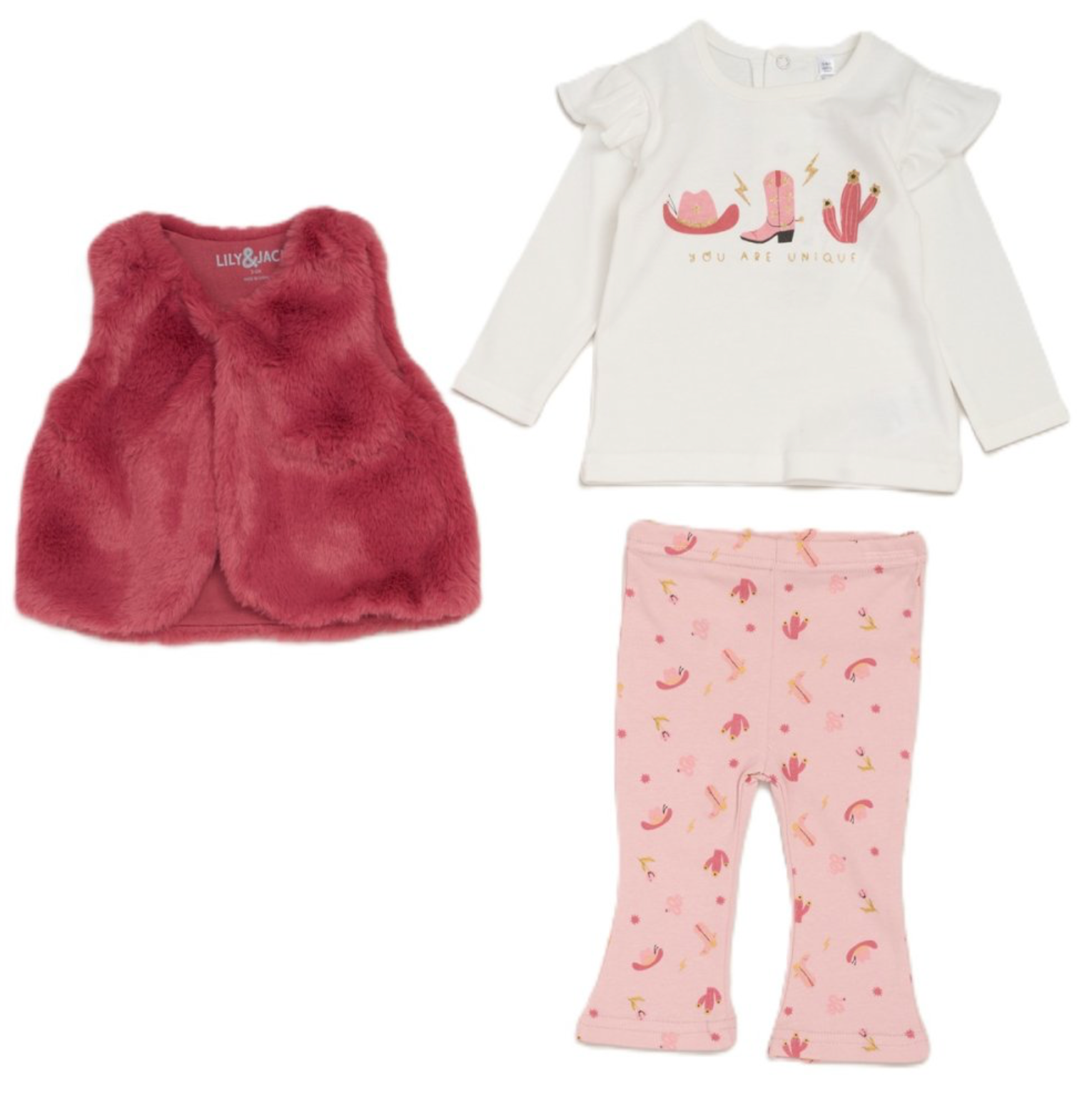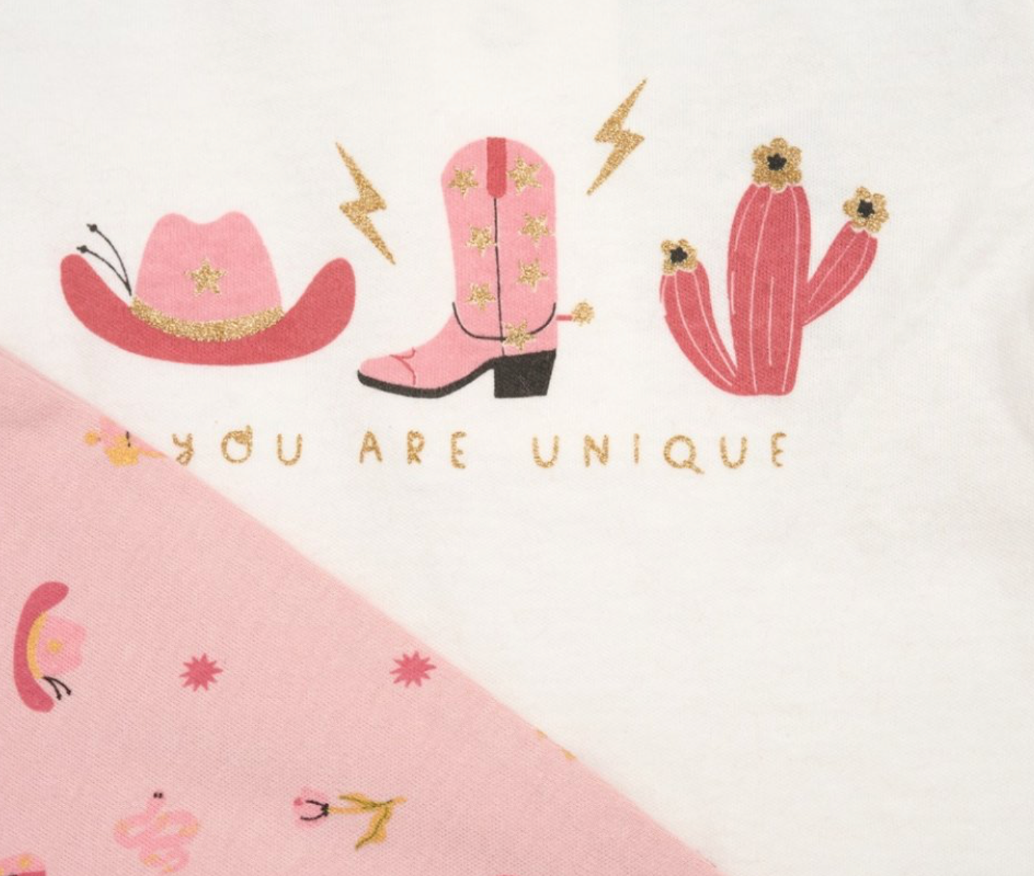 This fun three-piece outfit for girls includes a cosy fur gilet, a top featuring the playful message "you are unique" decorated with cowboy hat and boots, and matching flared bottoms. Perfect for adding a touch of western charm to her wardrobe while keeping her comfortable and stylish all day long.