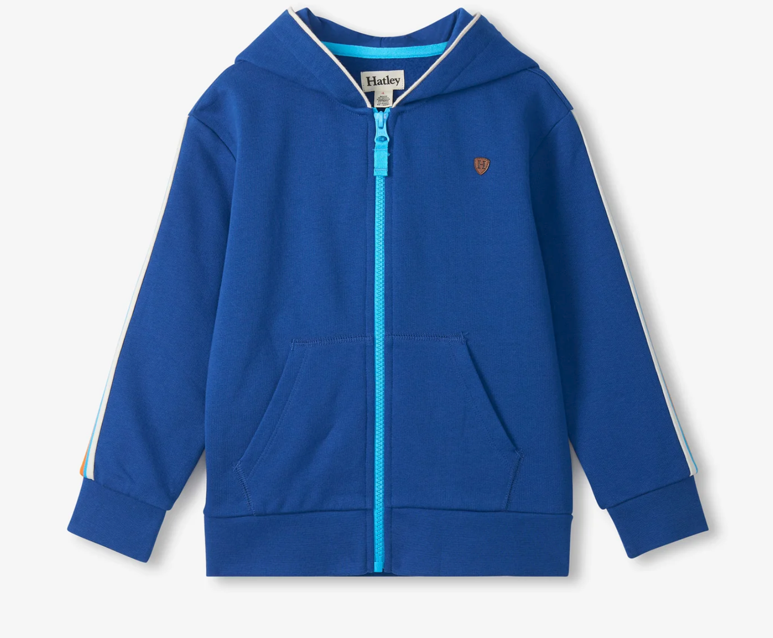Add a sporty touch to their everyday layers with this cozy blue zip-up hoodie. Crafted from soft cotton with a fully lined hood, it features a full front zipper in bright aqua blue and a roomy kangaroo pocket for warmth and convenience. Subtle stripe detailing in white, orange, and aqua runs down the sleeves for a touch of colour, while white piping along the hood adds a clean, finished look.