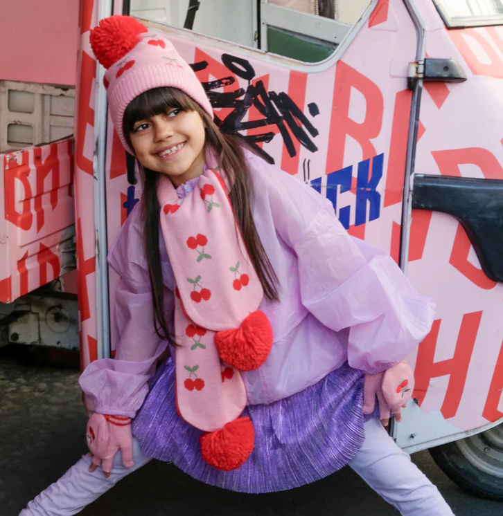 A pop of colour with the cheerful cherry knitted hat. Adorned with bright red cherries and a red pom pom. The hat is also fleeced lined for extra warmth.