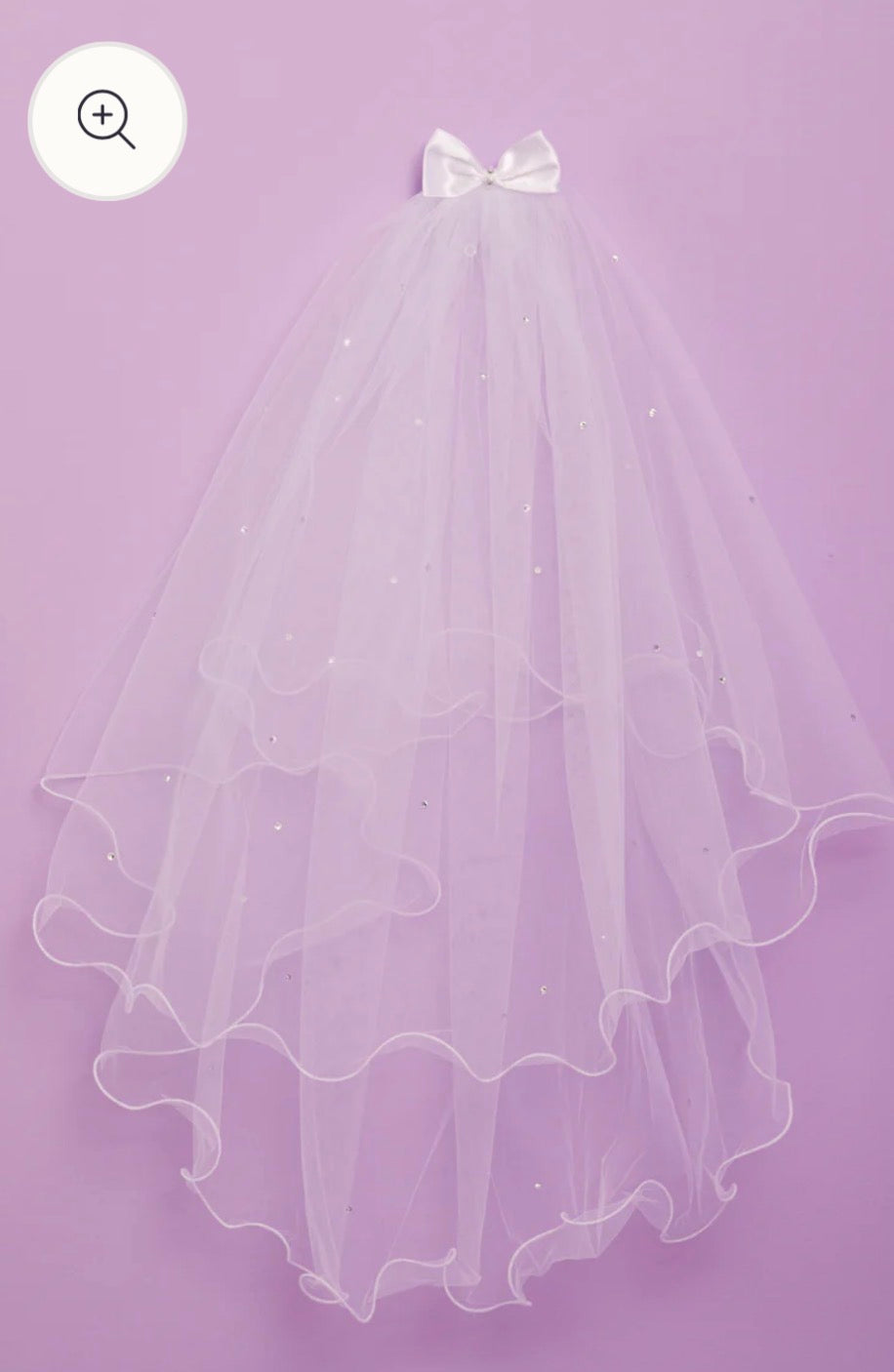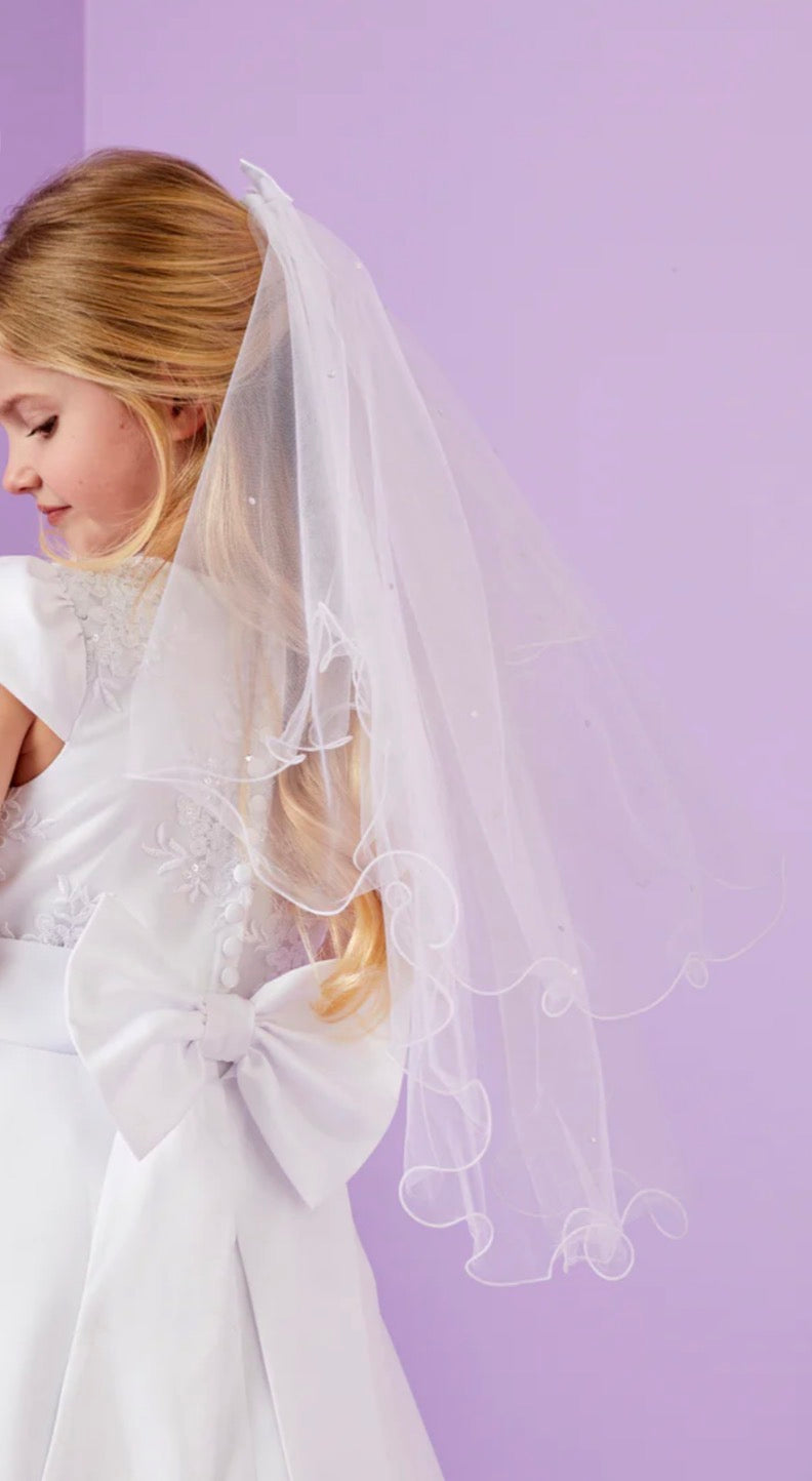 Communion Veil with curly hem and bow comb. This veil is absolutely beautiful and such a delicate addition to your childs Communion look . Comb to slip into hair.